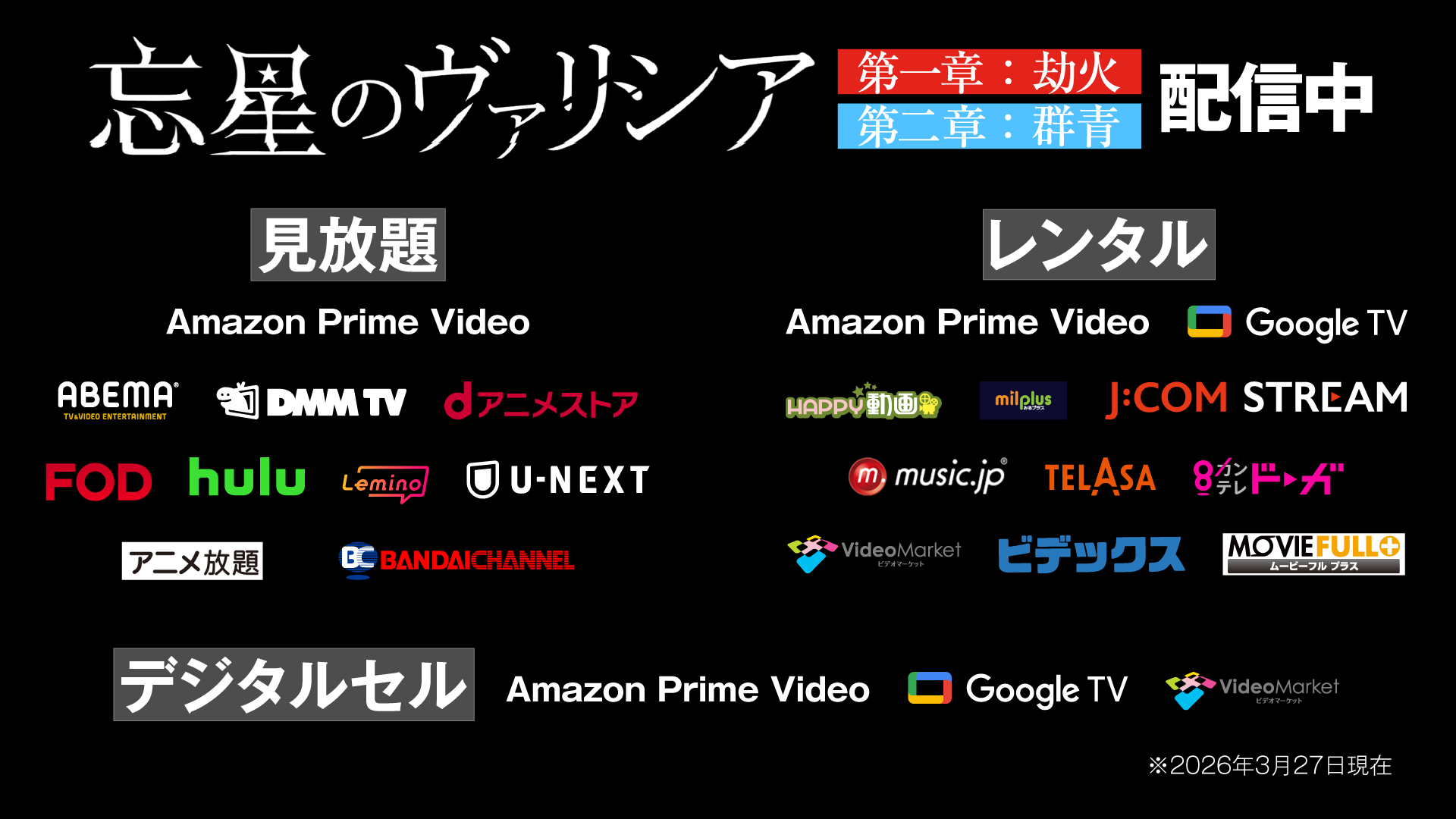 『忘星のヴァリシア 第一章:劫火』(2023年7月公開、個人配給) 『忘星のヴァリシア 第二章:群青』(2025年4月公開、配給:零合舎)配信先サービス一覧